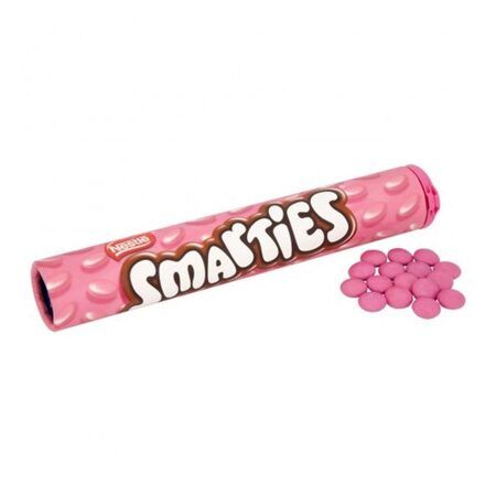 Smarties Pink Giant Tube 150 г. В 1882 года Йоркский бизнесмен Rowntree's начал производить "Шоколадные бобы Smarties", успешную компанию заметил крупный конгламират Nestle. Название компании в итоге сменили на короткое название Smarties, что в свою очередь было верным решением.