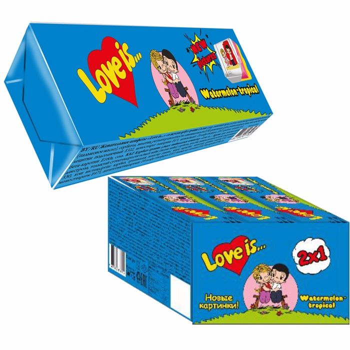 LOVE IS Конфеты- это ириски-стики, сочетающие в себе жевательную конфетку и сладость тропических фруктов.В блоке 12 конфет, каждая конфета - это пять жевательных стиков с вкладышами новой серии.