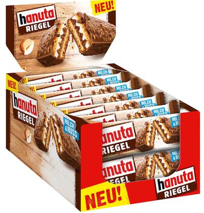 Вафельный батончик Hanuta с хрустящими вафлями с прослойкой молочным и ореховым кремом и покрытый молочным шоколадом.Просто восхитительное наслаждение! Три хрустящих вафельных слоя и между ними - два вкуснейших слоя сливок: один - молочный, второй насыщен лесным орехом. И всё это покрыто замечательным молочным шоколадом.В меру сладко и не в меру вкусно.