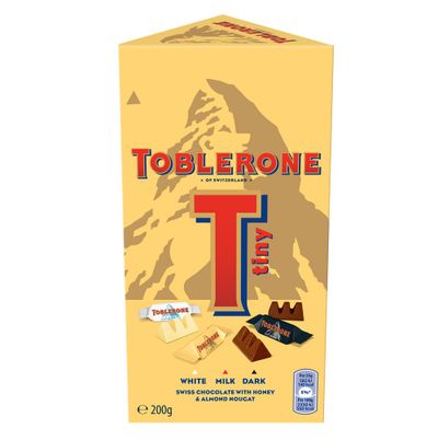 Toblerone Tiny Mix 200g - ассорти из белого, молочного и темного **швейцарского** шоколада. Индивидуальные конфеты можно использовать для подачи с кофе в кафе или в офисе. Ассорти производится на заводе в Швейцарии, что говорит о высоком качестве.