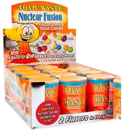 Американские Toxic Waste Candy – бочка запретных конфет. Производитель из США прославился изготовлением особенно взрывных сладостей с известным на весь мир лозунгом «Токсичные отходы». Кислые леденцы Toxic Waste любят дети.