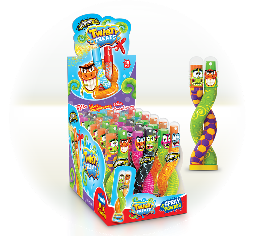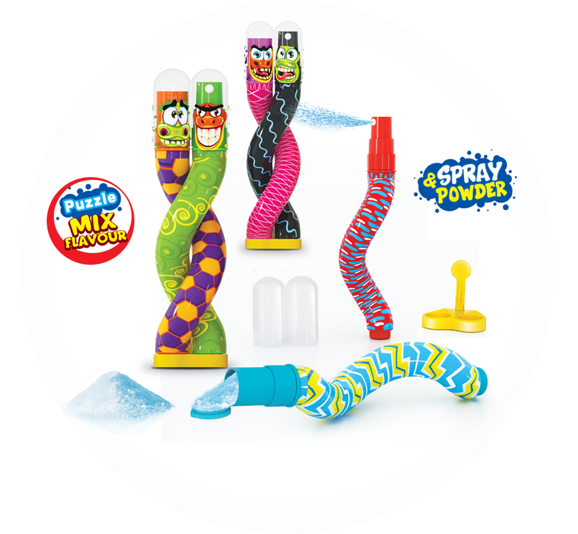 Жидкая конфета спрей Twisty Treats, 2в1: Две переплетенные змеи — жидкая конфета-спрей + пудра.